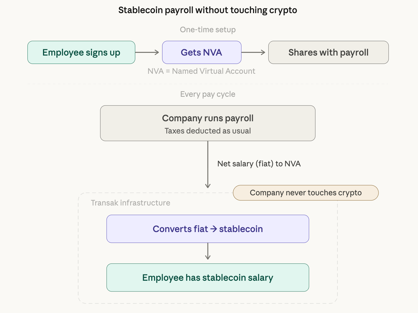 The named virtual account is the infrastructure unlock that makes this entire model work. Because the NVA is in the employee's name, the inbound transfer from the company is legally a payment to the employee, not a payment to Transak.